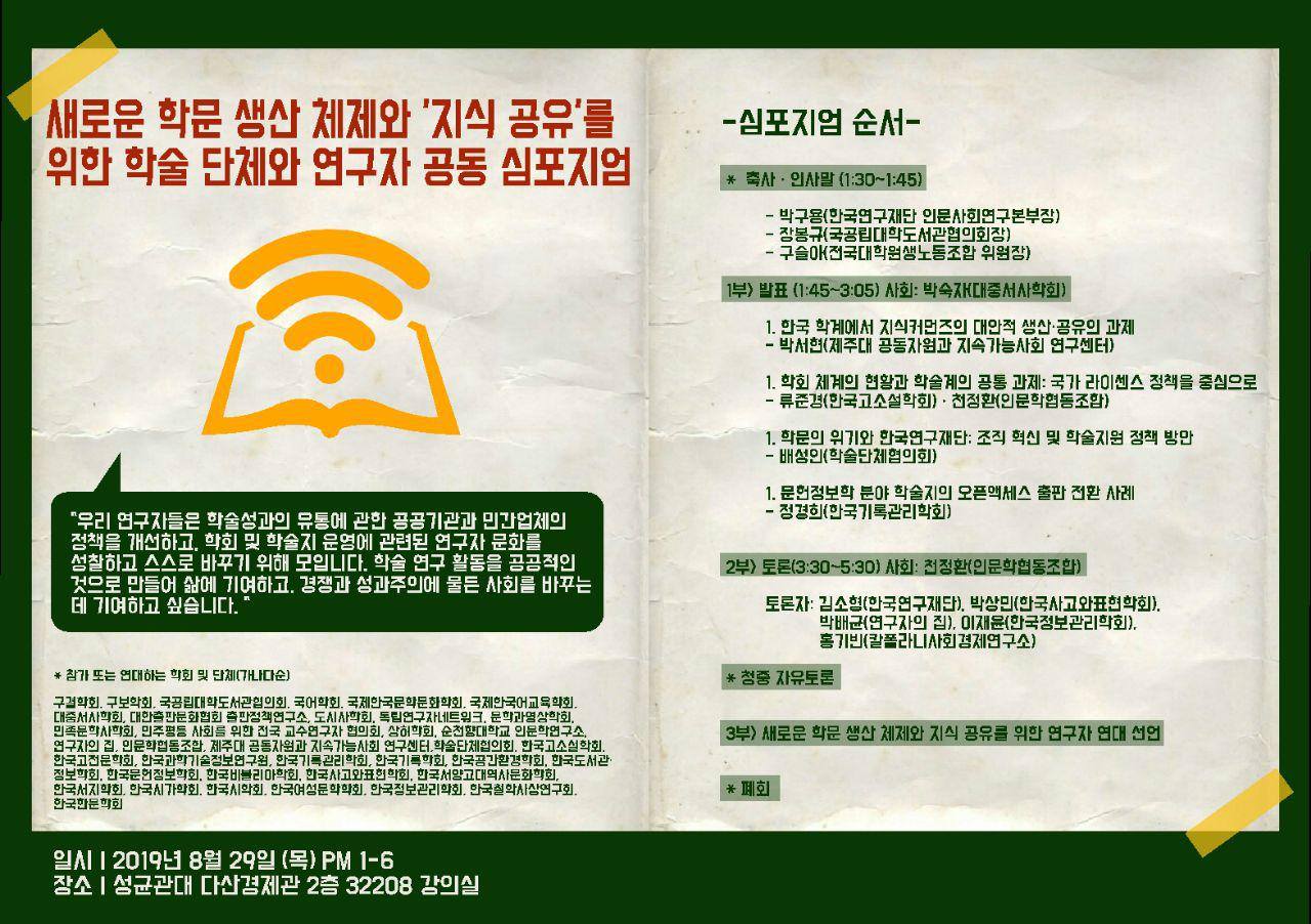 새로운 학문 생산체제와 ‘지식 공유’를 위한 학술 단체와 연구자 공동 심포지엄 자료실 * 일시: 2019년 8월 29일(목) * 장소: 성균관대학교 다산경제관 2층 32208호 자세한 내용은 아래 첨부파일을 참고해주시기 바랍니다. 학회연대체심포지엄-발표자료선언문보도자료 ♥422019년 8월 29일2023년 5월 11일자료실